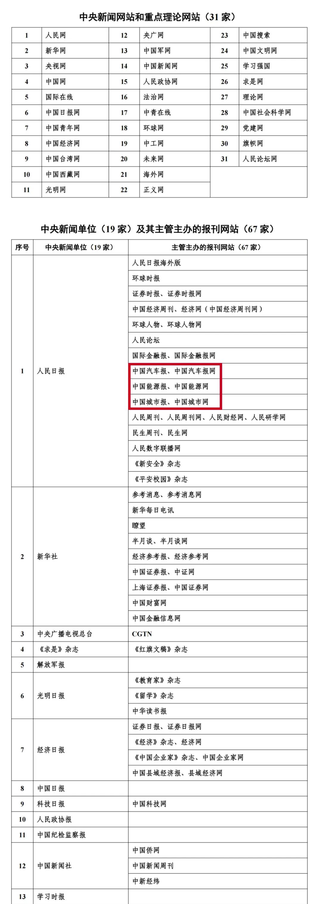 7月2日,中央网信办公布互联网新闻信息稿源单位名单,能汽集团下属中国汽车报及中国汽车报网、中国能源报及中国能源网、中国城市报及中国城市网均已进入名单,具体情况如下: