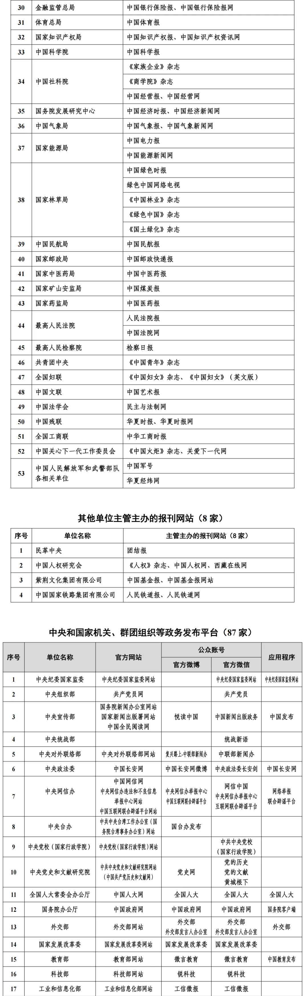 互联网新闻信息稿源单位名单仅明确列出稿源单位主体(报纸、期刊、通讯社、广播电台、电视台、互联网站),不再一一展示其公众账号、应用程序、论坛、博客、微博客、即时通信工具、网络直播等具体服务形式。其中,中央和国家机关、群团组织等政务发布平台和省级政务发布平台明确展示其官方网站、微博公众账号、微信公众账号、应用程序。
